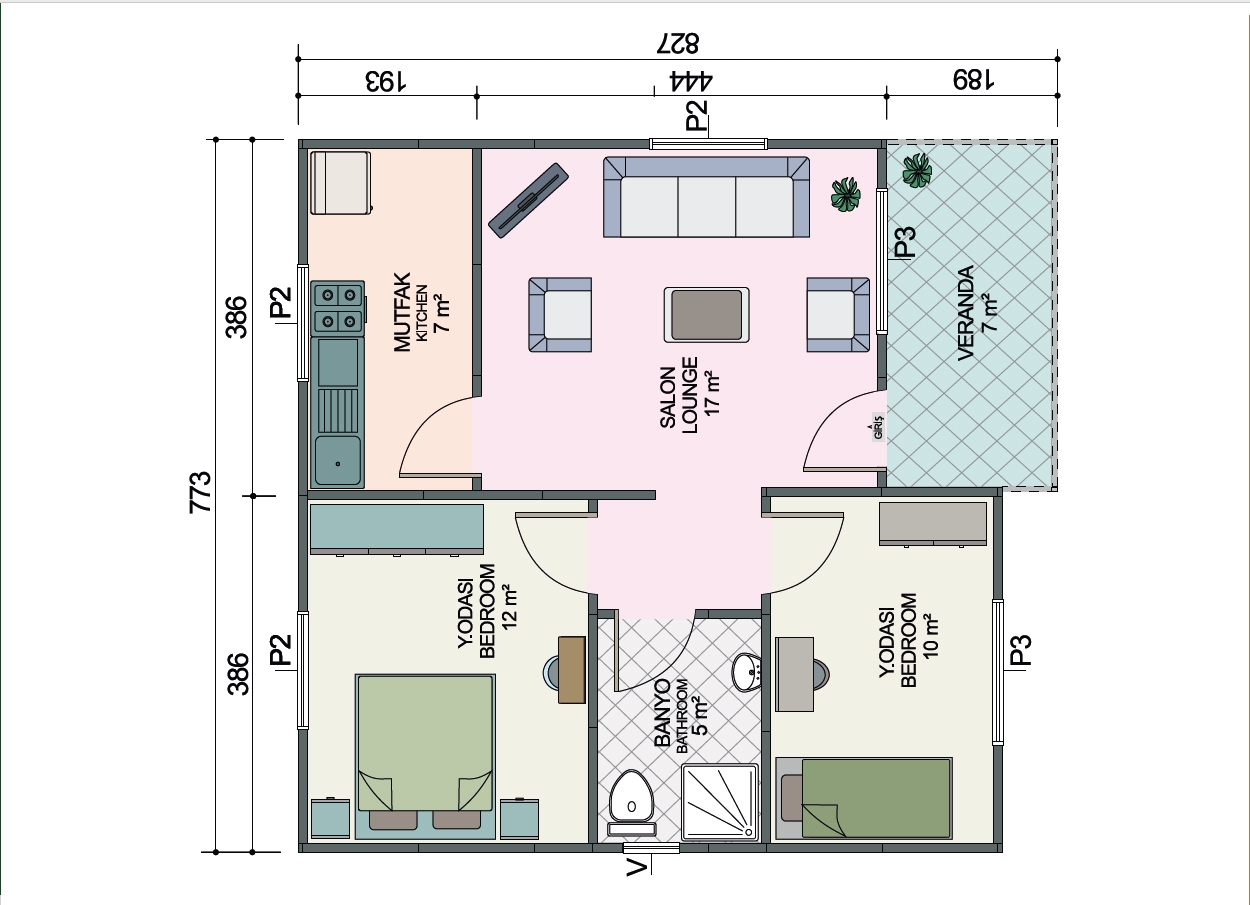 55 + 7 m2 veranda tek katlı prefabrik konut