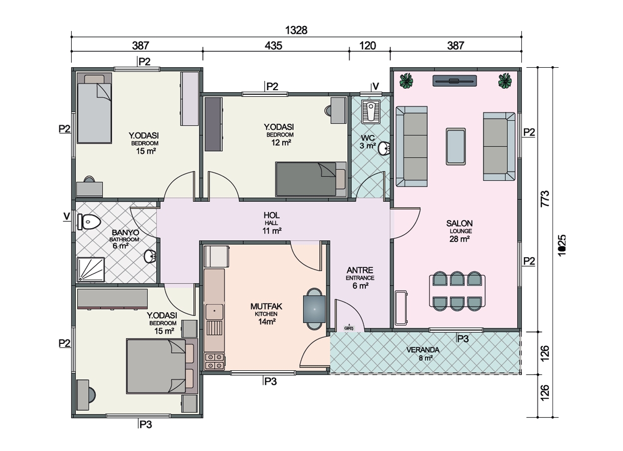 113 + 8 m 2 veranda tek katlı prefabrik konut