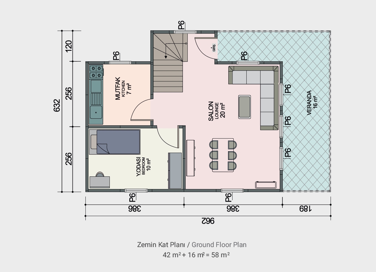 84 + 16 m2 veranda iki katlı prefabrik konut