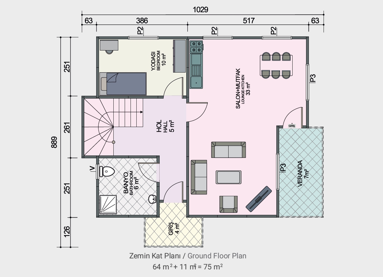 132 + 18 m2 veranda iki katlı prefabrik konut